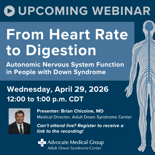 Through the generosity of donors, we are able to offer this webinar free of charge. If you would like to support the education efforts of the Adult Down Syndrome Center, please see our Advocate Giving page and select Adult Down Syndrome Center Research and Education from the Available Programs dropdown.