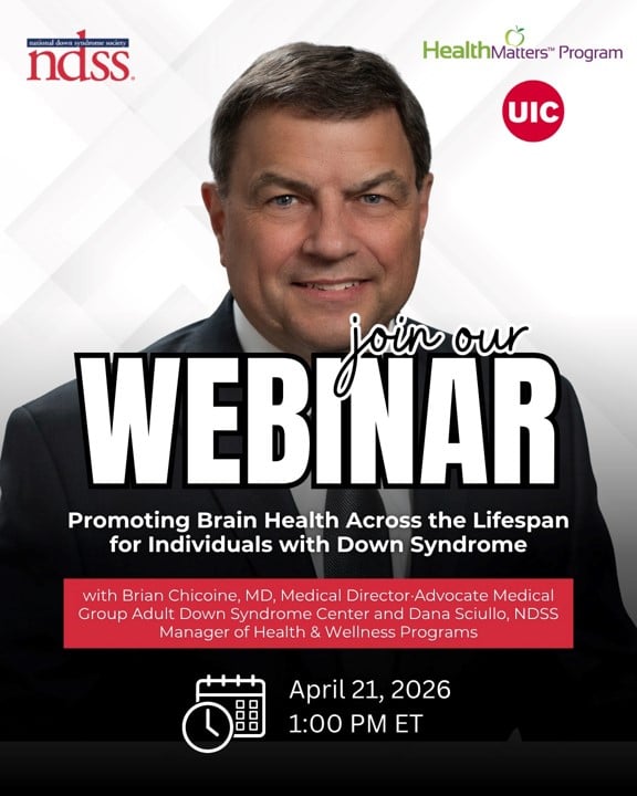 Description: The HealthMatters Program, UIC and the National Down Syndrome Society (NDSS) are partnering to co-host a webinar focused on promoting brain health across the lifespan for individuals with Down syndrome.